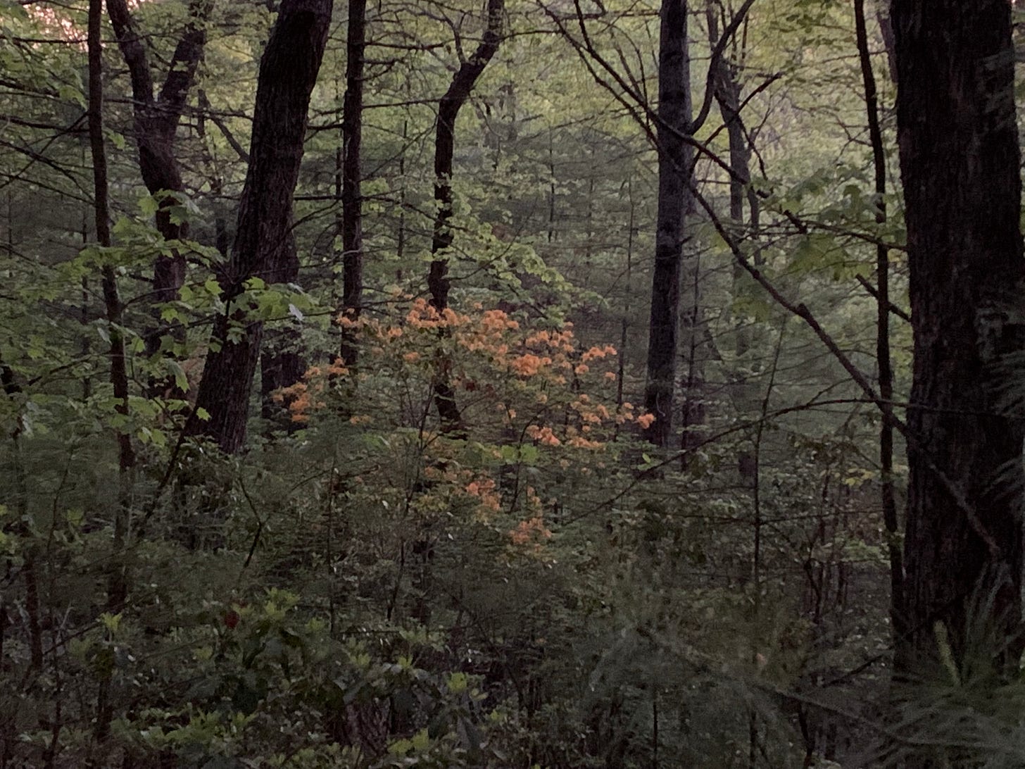 Last spring, I was walking through the forest on a north facing slope. It had rained on and off all day but now, the clouds were clearing in the early evening. A carmine sunset left a peculiar soft light flowing through the trees and across the forested slope. It made the greens from leaves and the feathery delicate ferns that carpeted the forest floor look mysterious and vibrant. Blooming flaming azaleas punctuated this emerald swath with a brilliant fire orange, like small individual fires floating effortlessly several yards off the ground. Natures glowing hearth’s pulsating, scattered between trees that moved ever so slightly from an evening breeze.